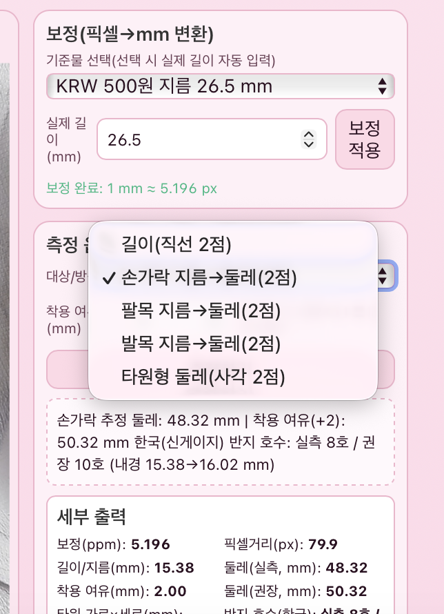 가락목줄자는 물체 기반으로 반지호수를 측정할 수 있는 도구입니당 먼저 사진을 준비하고 모드를 선택해서 기준물체와 측정할 신체부위를 두 점으로 클릭하여서 반지호수나 팔목 발목, 목이나 허리 치수 같은 것들을 측정할 수 있는 도구입니다