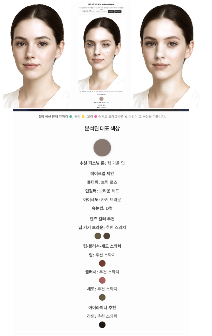 메이크업 메이커 – Makeup Maker사진을 업로드하고 진단 버튼을 누르세요. 아래 “가상 메이크업”에서 레이어와 브러시를 조절할 수 있어요.진단하기PNG 저장 3점 곡선 안내 앞머리 ●, 중간 ●,