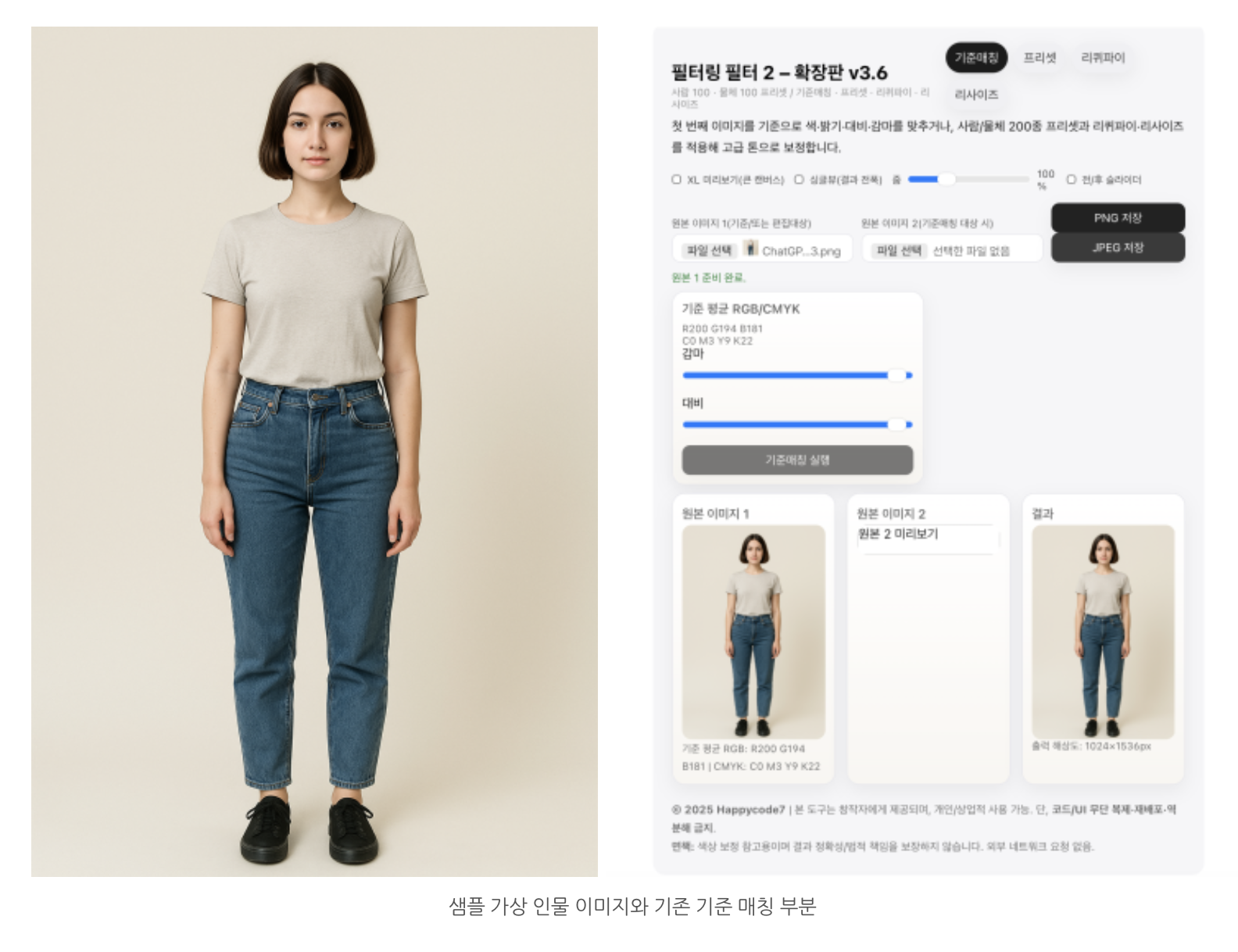 필터링 필터 2 – 확장판 v3.7 사람 100 · 물체 100 프리셋 / 기준매칭 · 프리셋 · 리퀴파이 · 리사이즈 기준매칭 프리셋 리퀴파이 리사이즈 첫 번째 이미지를 기준으로 색·밝기·대비·감마를 맞추