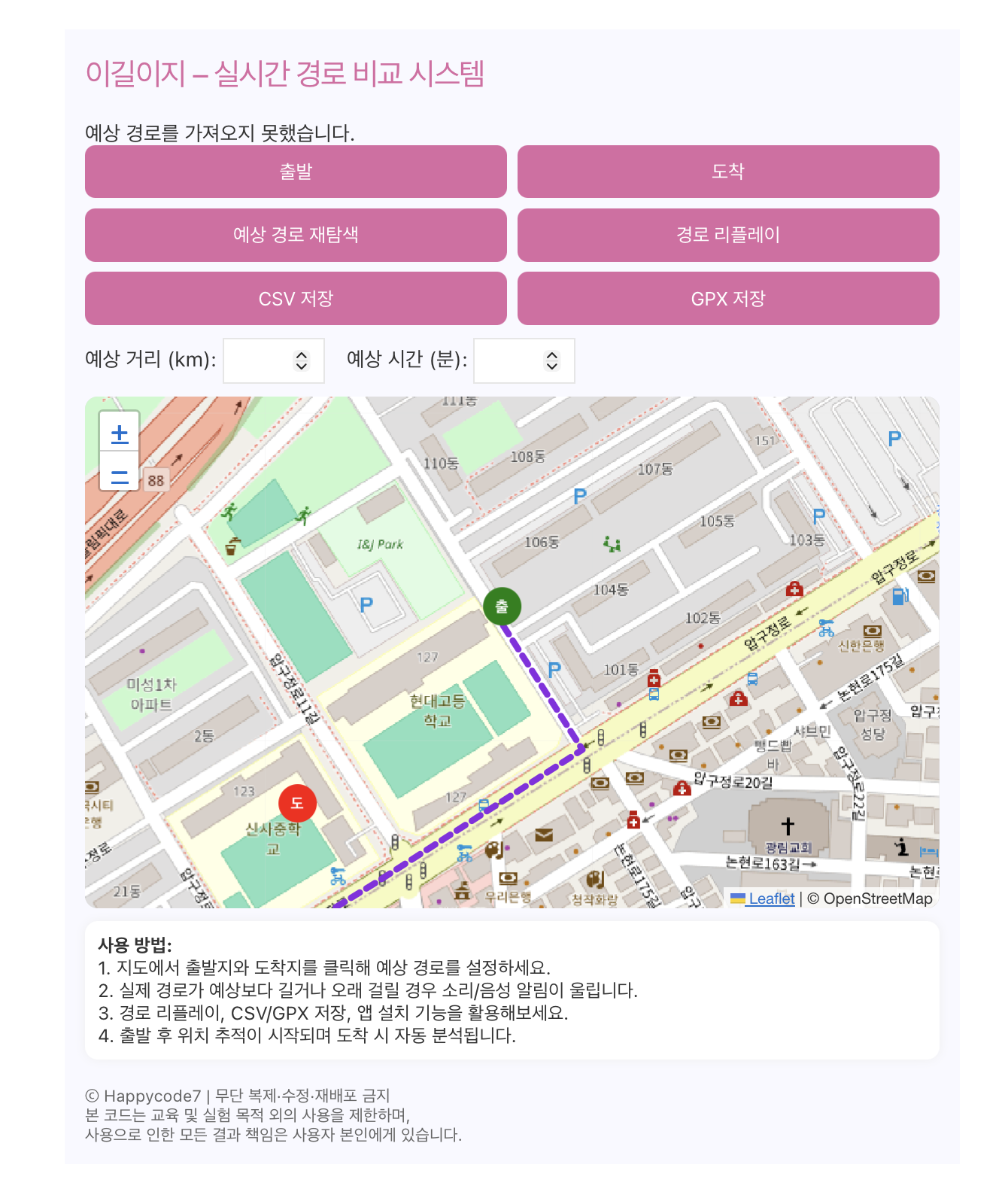 이길이지 – 실시간 경로 비교 시스템 위치를 가져오는 중... 출발 도착 예상 경로 재탐색 경로 리플레이 CSV 저장 GPX 저장 앱 설치 예상 거리 (km): 예상 시간 (분): 사용 방법: 1. 지도에서 출발지와