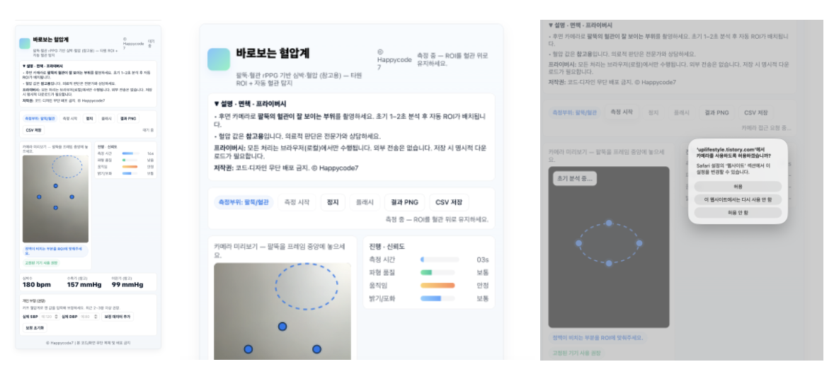 바로보는 혈압계 팔뚝·혈관 rPPG 기반 심박·혈압 (참고용) — 타원 ROI + 자동 혈관 탐지 © Happycode7 대기 중 설명 · 면책 · 프라이버시 • 후면 카메라로 팔뚝의 혈관이 잘 보이는 부위를 촬영하세