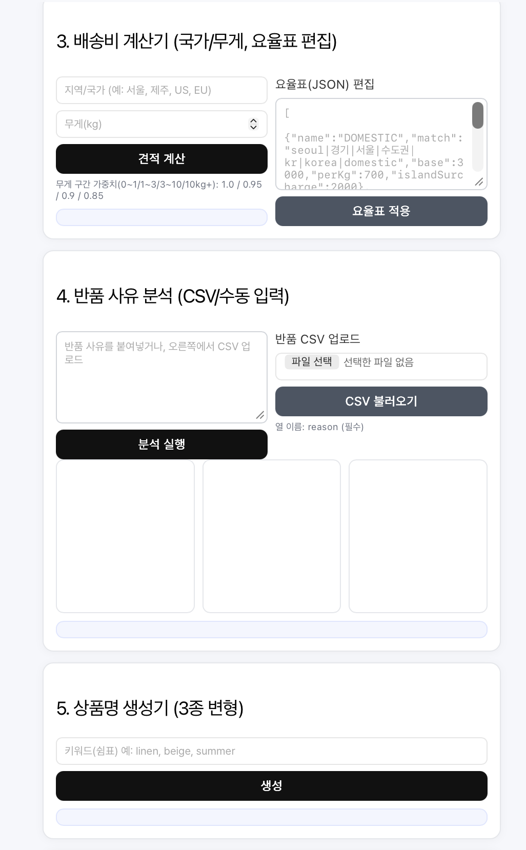 Serverless Smart Seller Toolkit – Happycode7 v2.0 0. 데이터 관리 (JSON/CSV) JSON 가져오기 불러오기 현재 데이터 내보내기 JSON 저장 CSV 저장(요약) CSV 형식 예시 — 리뷰: order_id,review_text,rating / 반품: order_id,reas