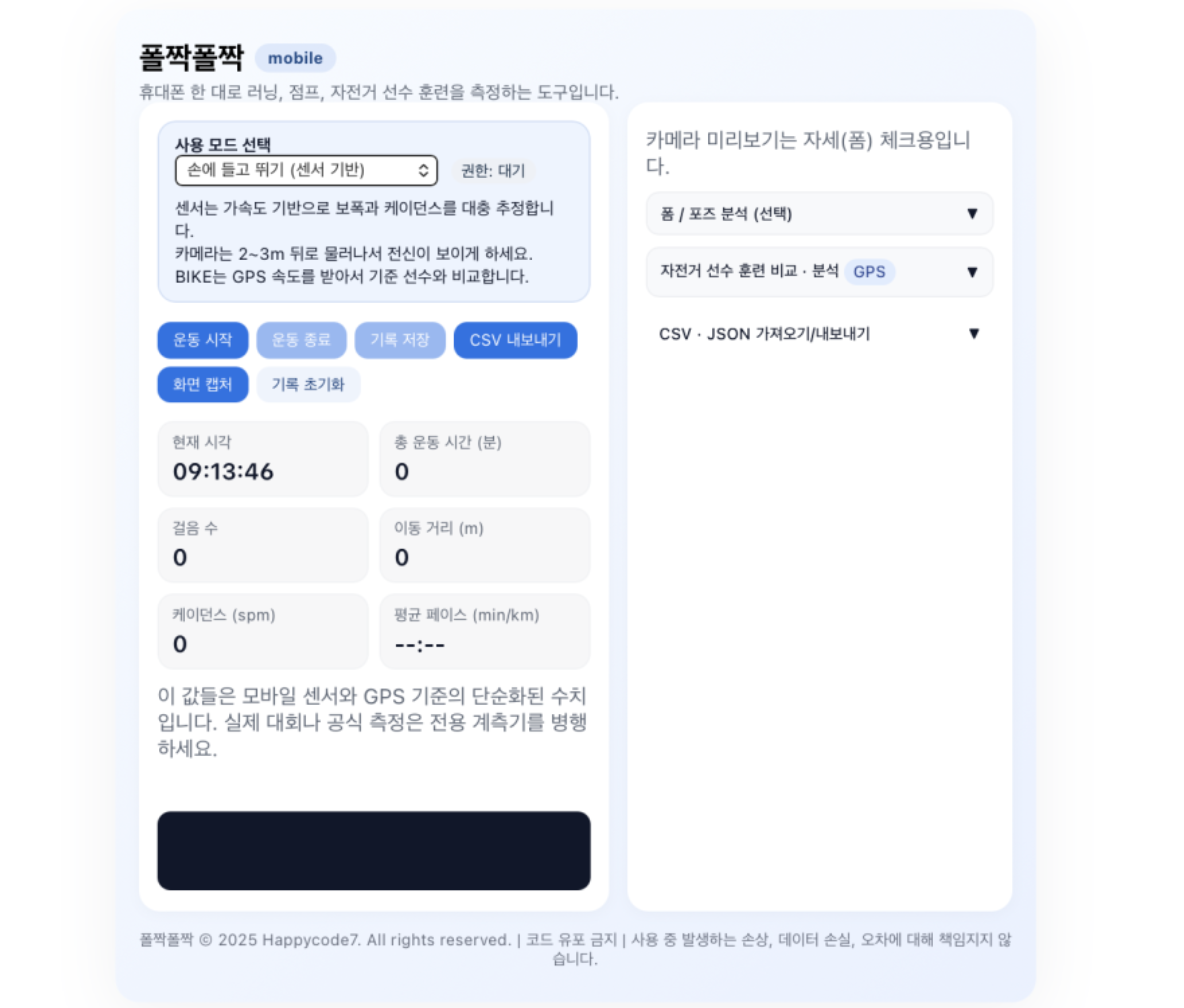 폴짝폴짝 – 모바일 운동 측정 (센서/카메라/GPS) 폴짝폴짝 mobile 휴대폰 한 대로 러닝, 점프, 자전거 선수 훈련을 측정하는 도구입니다. 사용 모드 선택 손에 들고 뛰기 (센서 기반) 카메라 기반 (