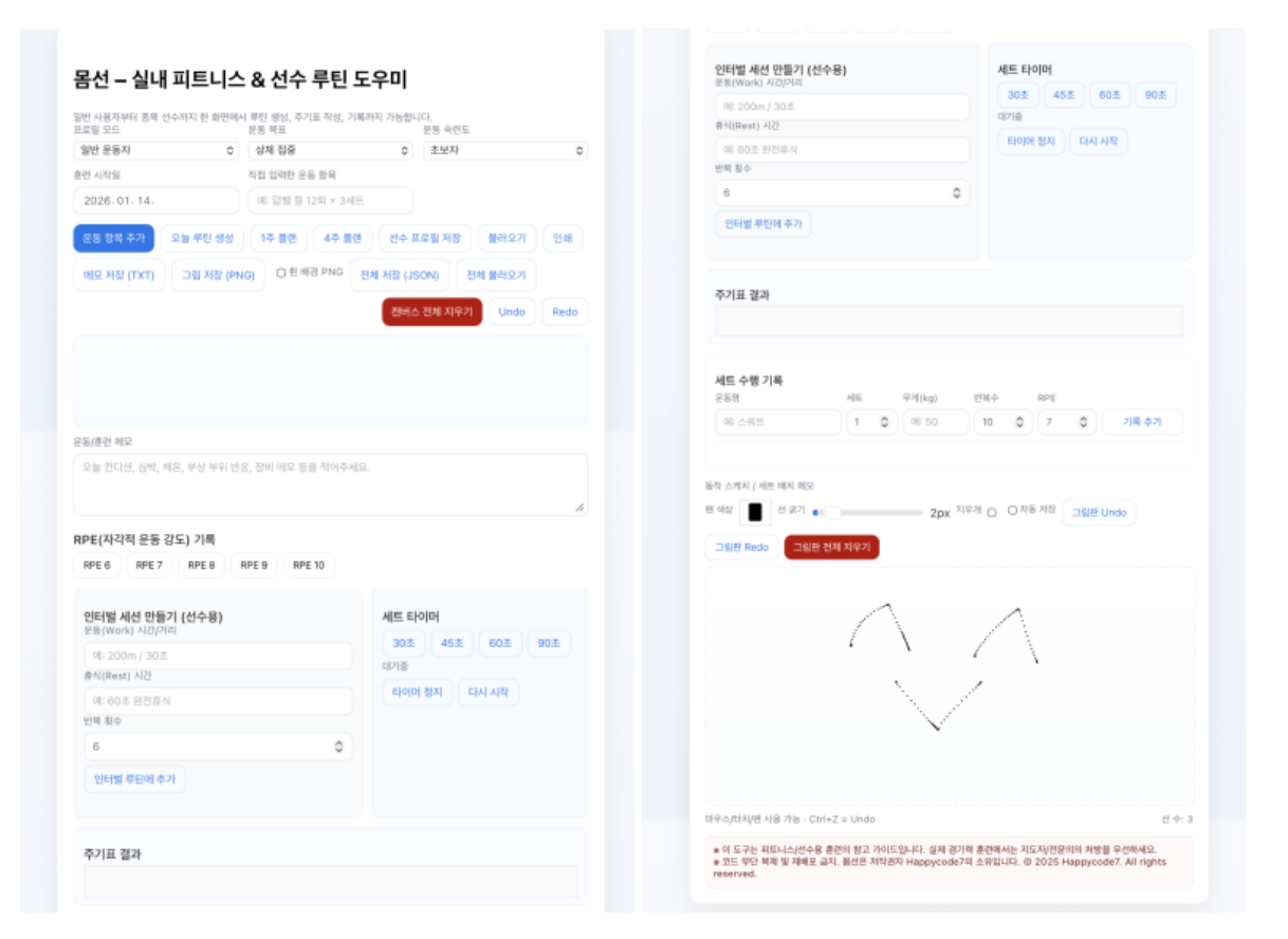 -->몸선 – 실내 피트니스 & 선수 루틴 도우미 © 2025 Happycode7 몸선 – 실내 피트니스 & 선수 루틴 도우미 일반 사용자부터 종목 선수까지 한 화면에서 루틴 생성, 주기표 작성, 기록까지 가능합니