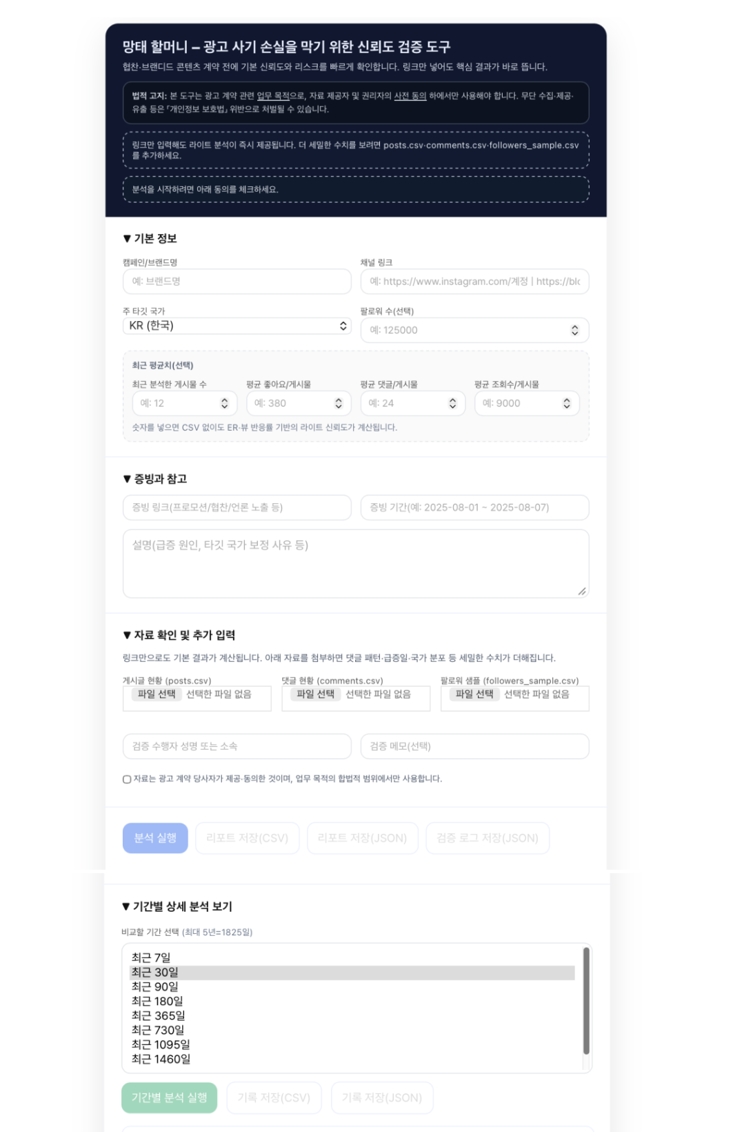 망태할머니,망태할머니도구,해피코드7,Happycode7,광고사기예방,광고사기,협찬사기,브랜디드콘텐츠,인플루언서마케팅,인플루언서검증,인플루언서사기,가짜팔로워,유령팔로워,팔로워구매,댓글작업,가짜댓글,중복댓글,유사댓글,참여율,ER,EngagementRate,조회수분석,뷰반응률,광고성과측정,캠페인트래킹,UTM,utm_source,utm_medium,utm_campaign,gclid,fbclid,링크검증,URL검증,단축링크,리다이렉트,피싱예방,스푸핑,도메인검증,HTTPS,보안도구,마케팅보안,디지털포렌식,라이트분석,리스크진단,신뢰도점수,리스크스코어,데이터분석,CSV분석,댓글분석,팔로워샘플,국가분포,타깃국가,유입분석,트래픽분석,급증일,스파이크분석,이상탐지,브랜드세이프티,광고주보호,계약검증,분쟁예방,성과분쟁,증빙자료,리포트자동화,JSON리포트,CSV리포트,브라우저로컬분석,개인정보보호,합법적데이터,동의기반분석,마케터도구,브랜드마케팅,퍼포먼스