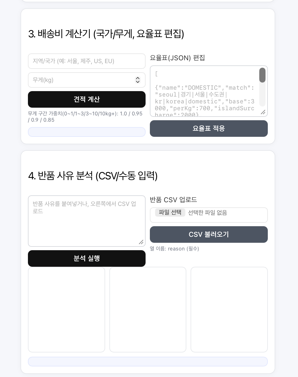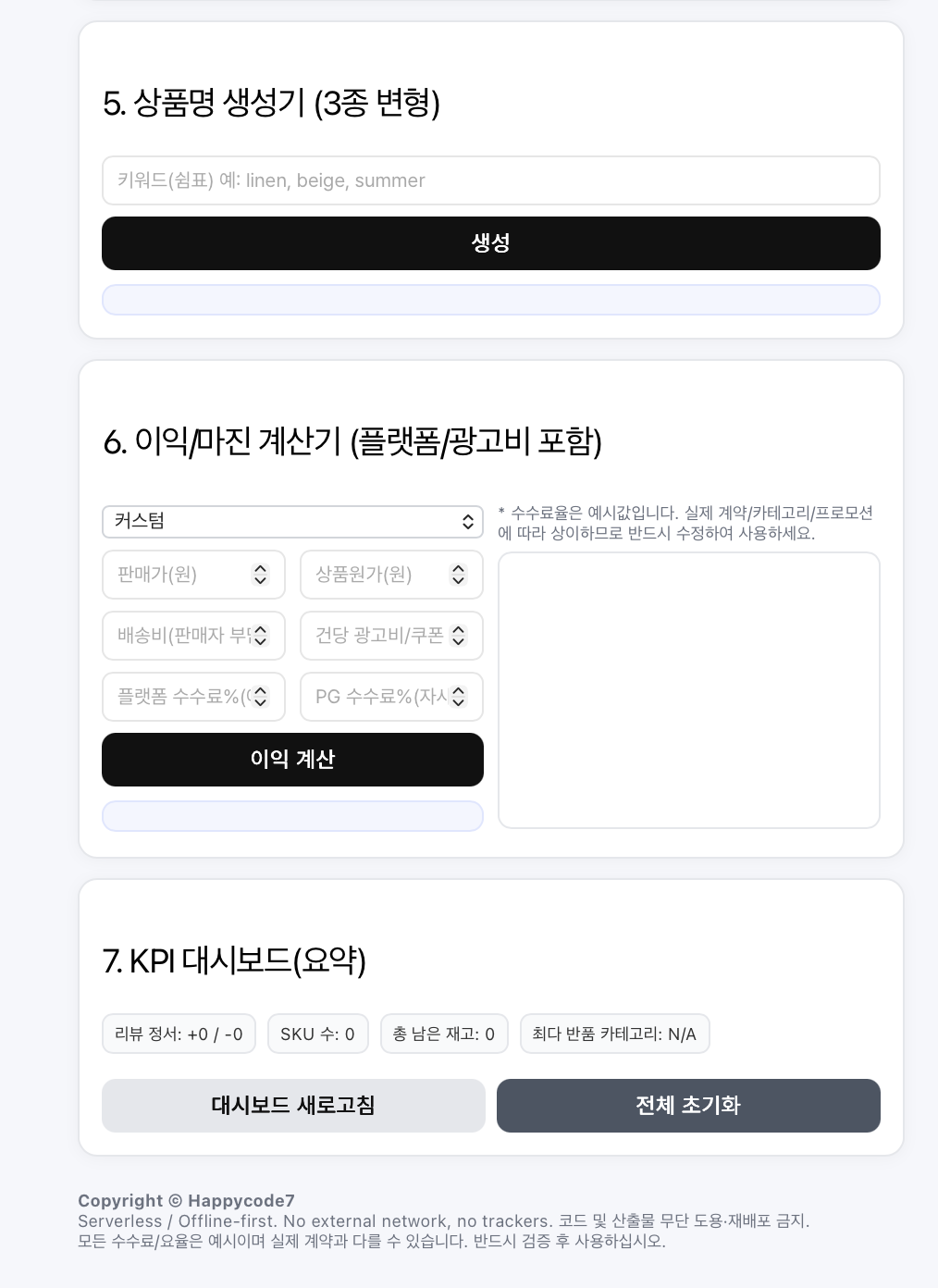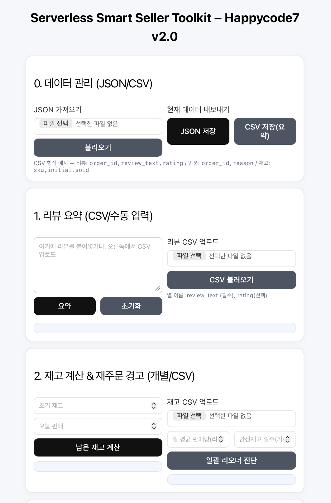 Serverless Smart Seller Toolkit – Happycode7 v2.0 0. 데이터 관리 (JSON/CSV) JSON 가져오기 불러오기 현재 데이터 내보내기 JSON 저장 CSV 저장(요약) CSV 형식 예시 — 리뷰: order_id,review_text,rating / 반품: order_id,reas