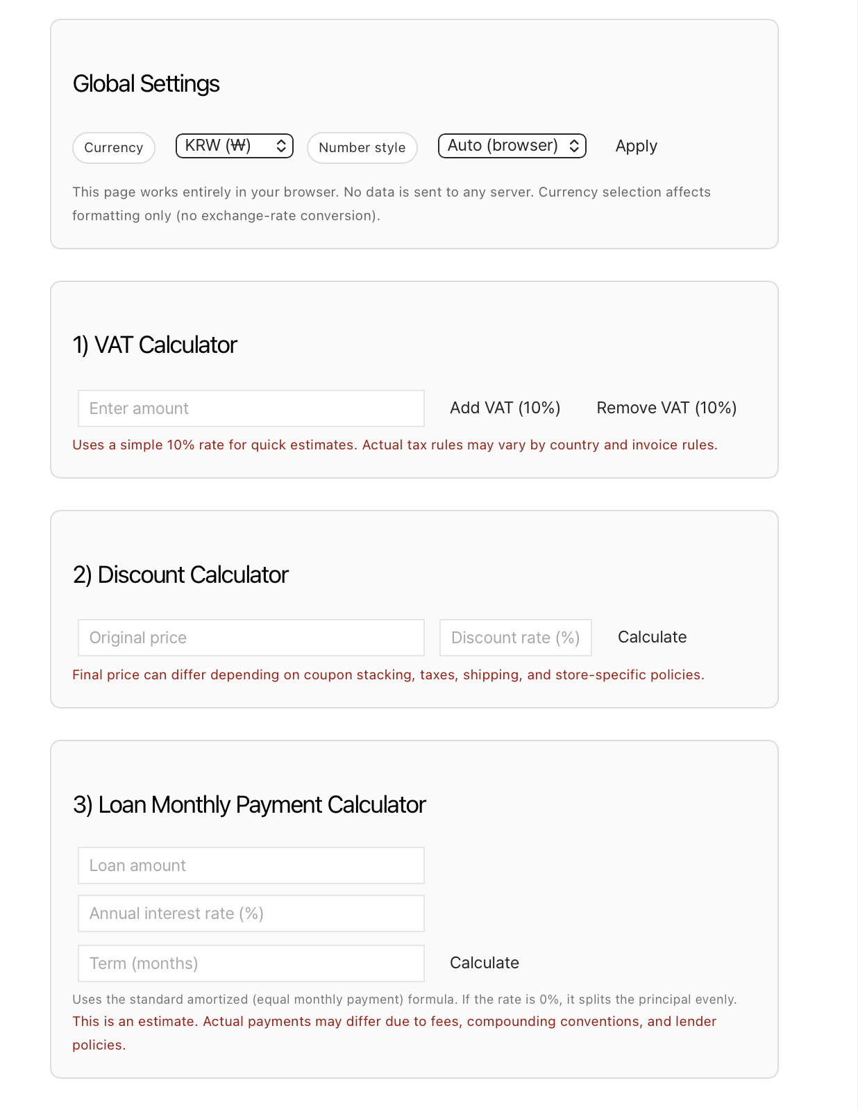 Real-Life Calculators (VAT, Discount, Loan, BMI, Fuel Economy) © 2026 Happycode7. All rights reserved.Global SettingsCurrencyKRW (₩)USD ($)EUR (€)JPY (¥)GBP (£)CNY (¥)AUD ($)CAD ($)SGD ($)HKD ($)INR (₹)BRL (R$)MXN ($)CHF (CHF)SEK (kr)NOK (kr)DKK