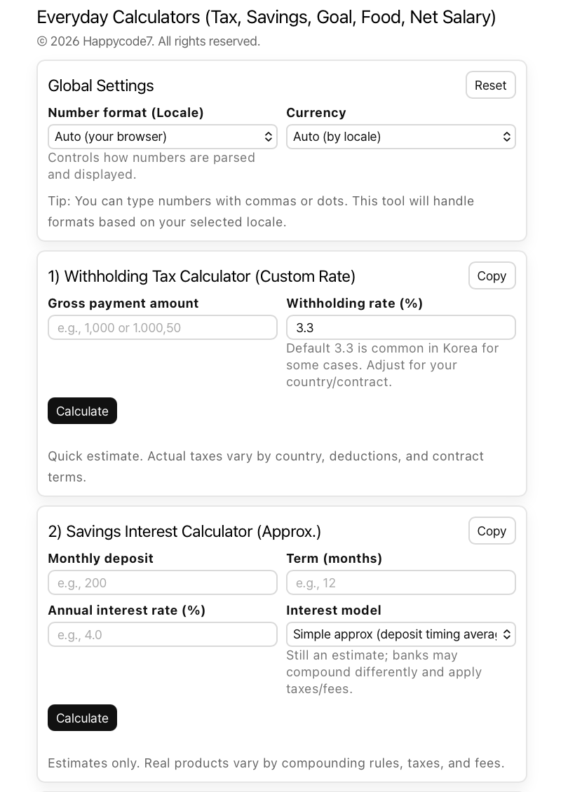 Everyday Calculators (Tax, Savings, Goal, Food, Net Salary) © 2026 Happycode7. All rights reserved. Global Settings Reset Number format (Locale) Auto (your browser) English (US) - 1,234.56 English (UK) - 1,234.56 Deutsch (DE) - 1.234,56 Français (FR) - 1