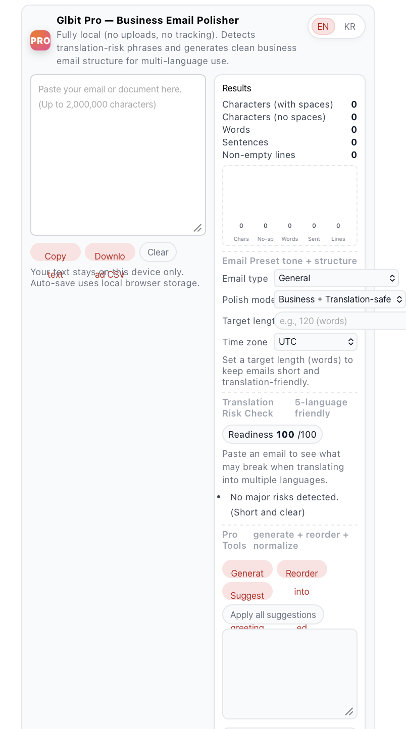 PRO Glbit Pro — Business Email Polisher Fully local (no uploads, no tracking). Detects translation-risk phrases and generates clean business email structure for multi-language use. EN KR Paste or write text to analyze Copy text Do..