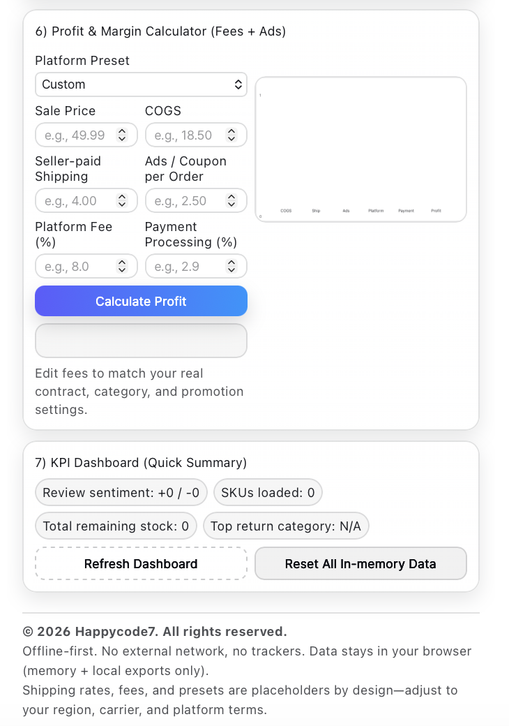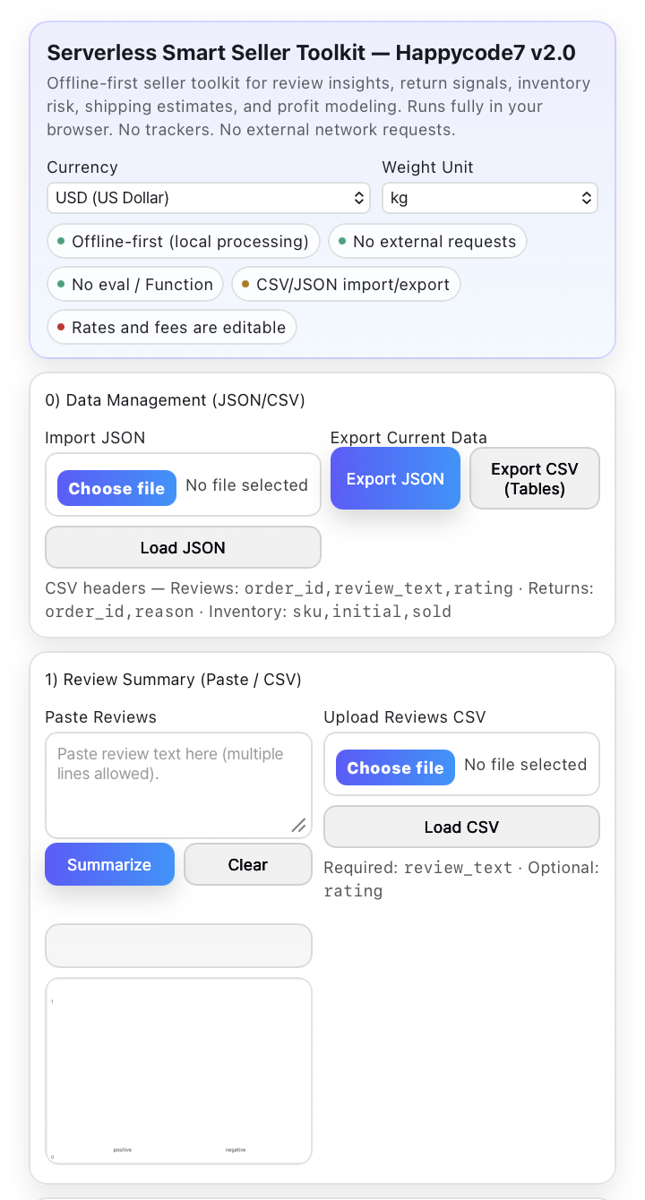 Serverless Smart Seller Toolkit — Happycode7 v2.0 Offline-first seller toolkit for review insights, return signals, inventory risk, shipping estimates, and profit modeling. Runs fully in your browser. No trackers. No external network requests. Currency U