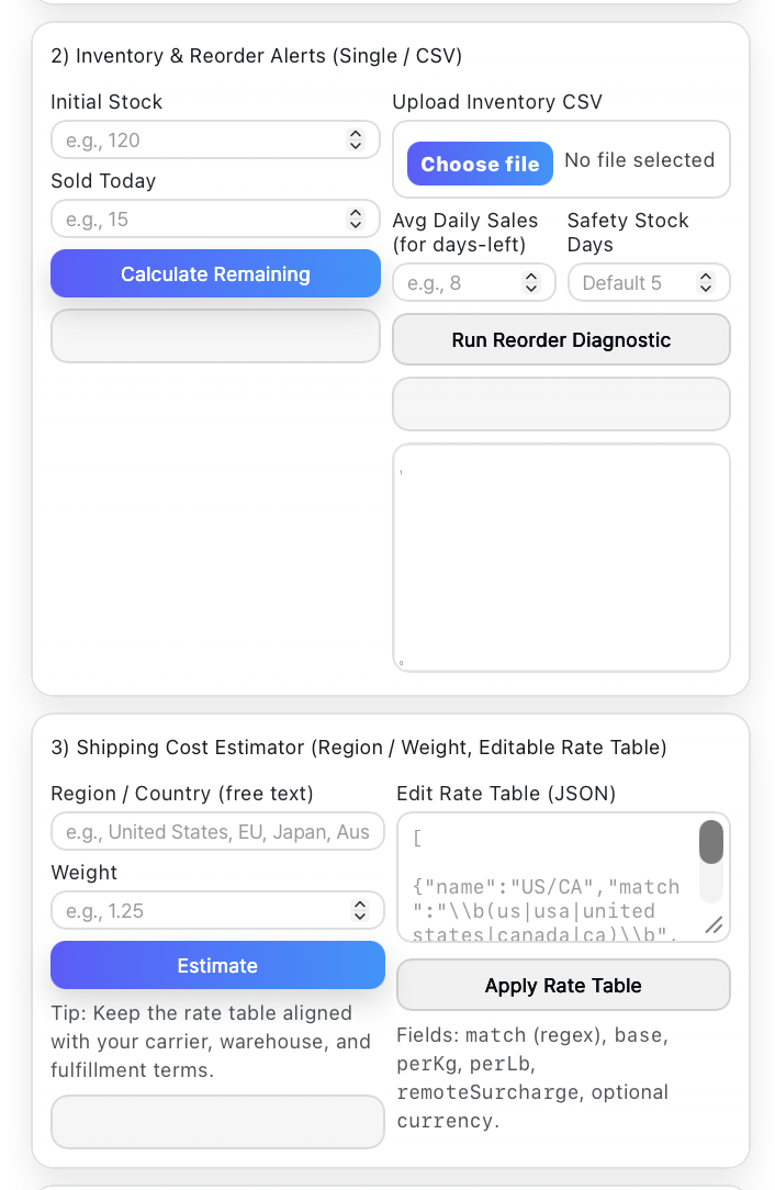 Any outputs generated by this tool, including but not limited to review summaries, return-reason classifications, inventory diagnostics, shipping cost estimates, profit calculations, margin calculations, and performance insights, are for informational purposes only and are based entirely on user-provided data, editable settings, assumptions, and estimation logic. Actual results may differ from real-world sales performance, return rates, logistics costs, customs duties, taxes, platform fees, payment processing fees, advertising costs, settlement amounts, and country-specific regulatory outcomes.