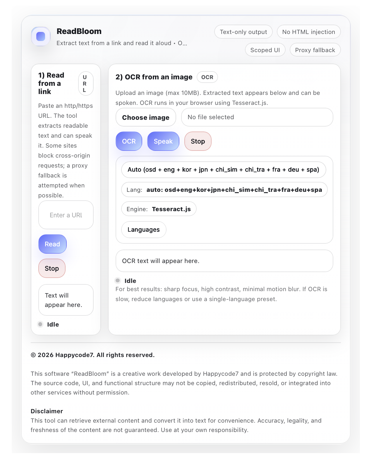 ReadBloom Extract text from a link and read it aloud • OCR from images (multi-language) Text-only output No HTML injection Scoped UI Proxy fallback 1) Read from a link URL Paste an http/https URL. The tool extracts readable text and can speak it. Some si