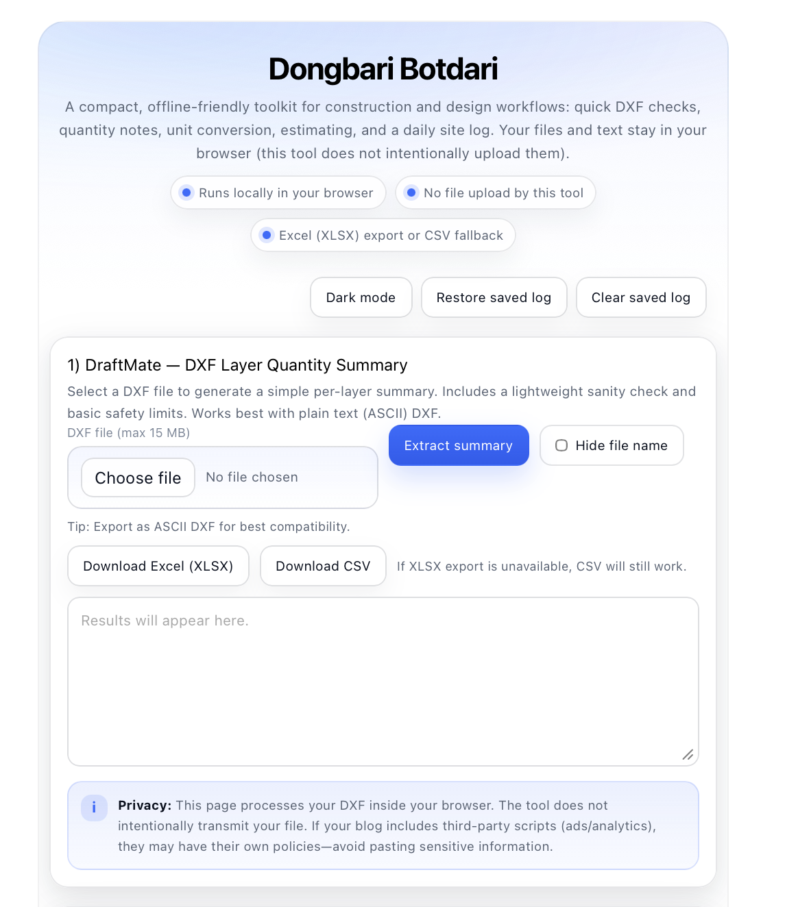Dongbari Botdari A compact, offline-friendly toolkit for construction and design workflows: quick DXF checks, quantity notes, unit conversion, estimating, and a daily site log. Your files and text stay in your browser (this tool does not intentionally uplo