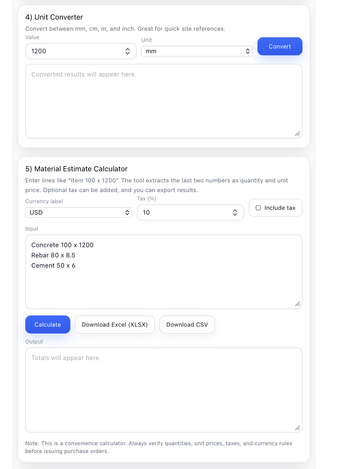 Users are solely responsible for verifying all calculations, quantities, measurements, and project data before applying them to real construction projects.