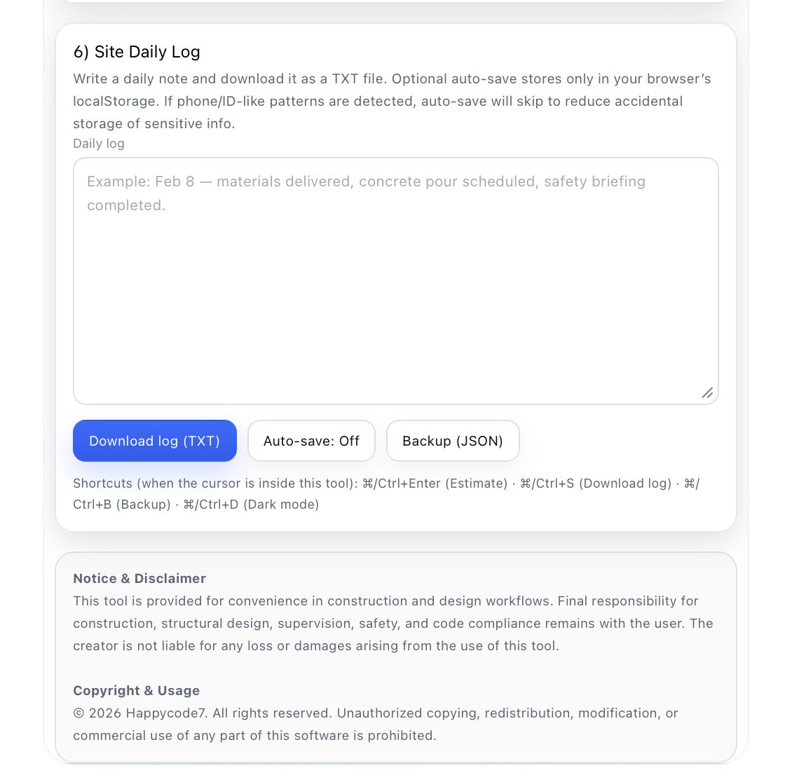 Whether you are reviewing DXF layers, estimating materials, documenting daily site progress, or converting measurement units during field work, this toolkit offers a simple and practical environment for managing small but essential tasks in construction and engineering workflows.