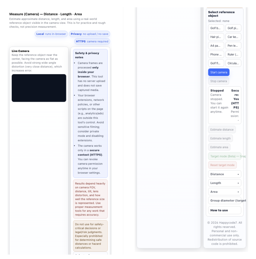 Measure (Camera) — Distance · Length · Area Estimate approximate distance, length, and area using a real-world reference object visible in the camera view. This is for practice and rough checks, not precision measurement. Local runs in-browser Privacy