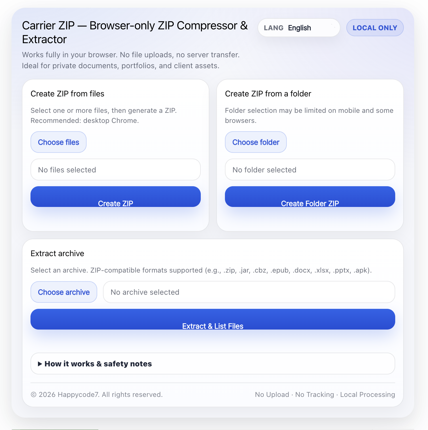 Carrier ZIP — Browser-only ZIP Compressor & Extractor Works fully in your browser. No file uploads, no server transfer. Ideal for private documents, portfolios, and client assets. LANG English 한국어 日本語 中文 Español LOCAL ONLY Create ZIP fro