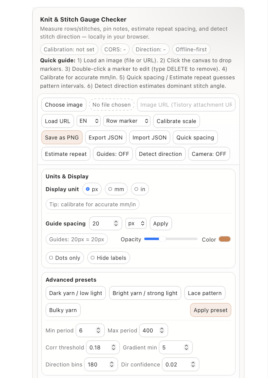 The Knit & Stitch Gauge Checker is a browser-based knitting measurement tool designed for creators who want fast, accurate, and private analysis without relying on external apps or cloud processing.