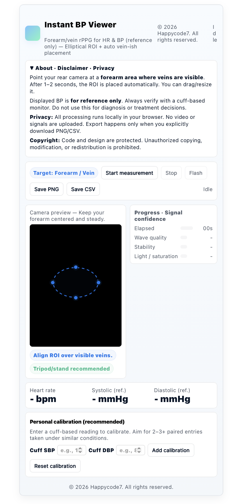 Instant BP Viewer Forearm/vein rPPG for HR & BP (reference only) — Elliptical ROI + auto vein-ish placement © 2026 Happycode7. All rights reserved. Idle About · Disclaimer · Privacy Point your rear camera at a forearm area where veins are visible. Aft