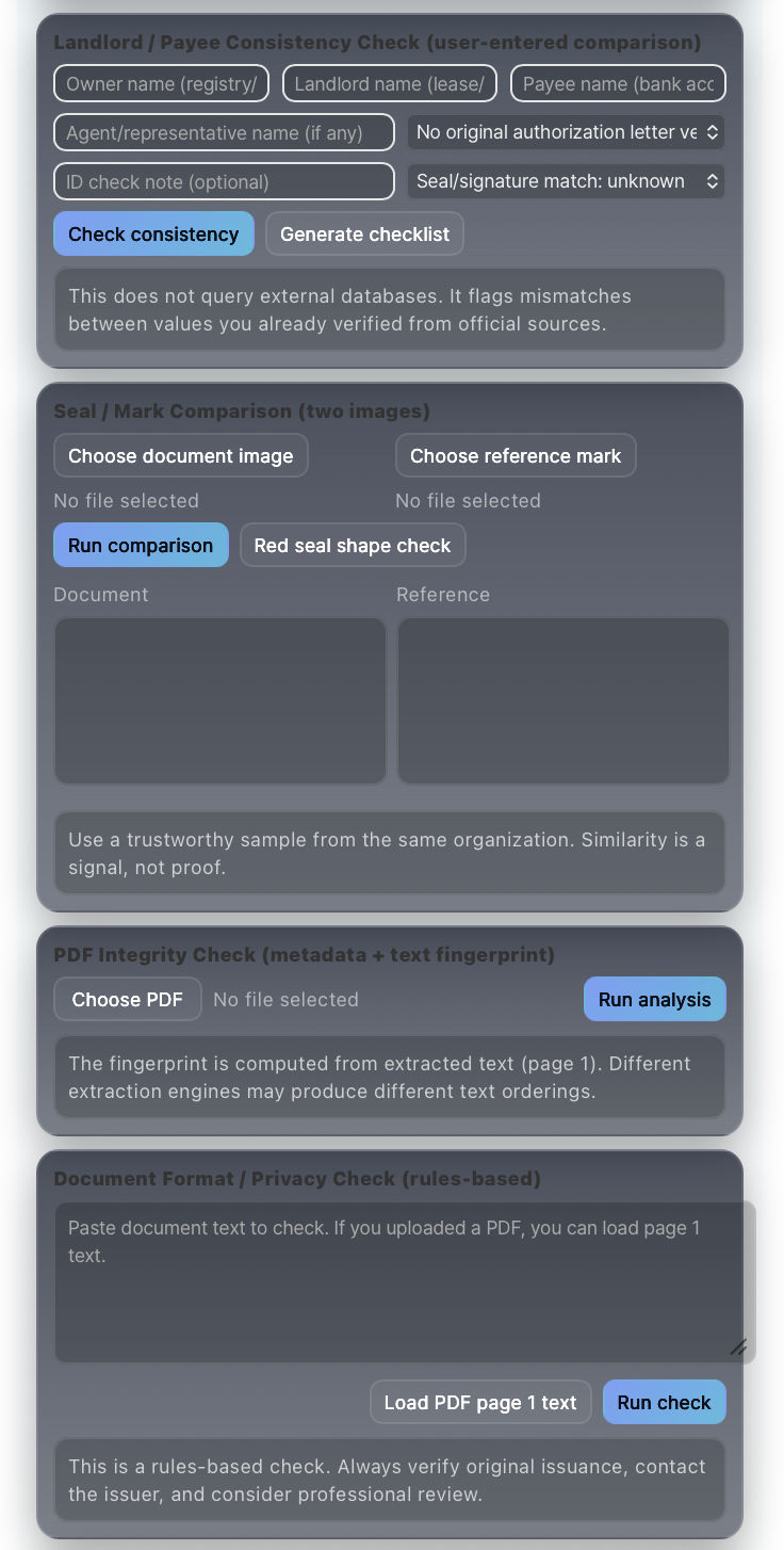 All analysis results, including image integrity signals, PDF fingerprints, seal comparisons, and rental risk estimations, are heuristic indicators and should not be interpreted as definitive proof of authenticity or fraud.