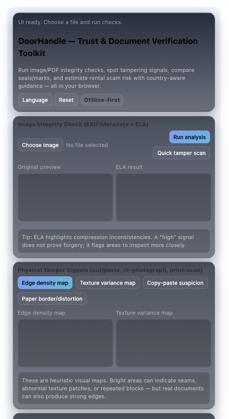 Loading UI… DoorHandle — Trust & Document Verification Toolkit Run image/PDF integrity checks, spot tampering signals, compare seals/marks, and estimate rental scam risk with country-aware guidance — all in your browser. Language Reset Offline-first
