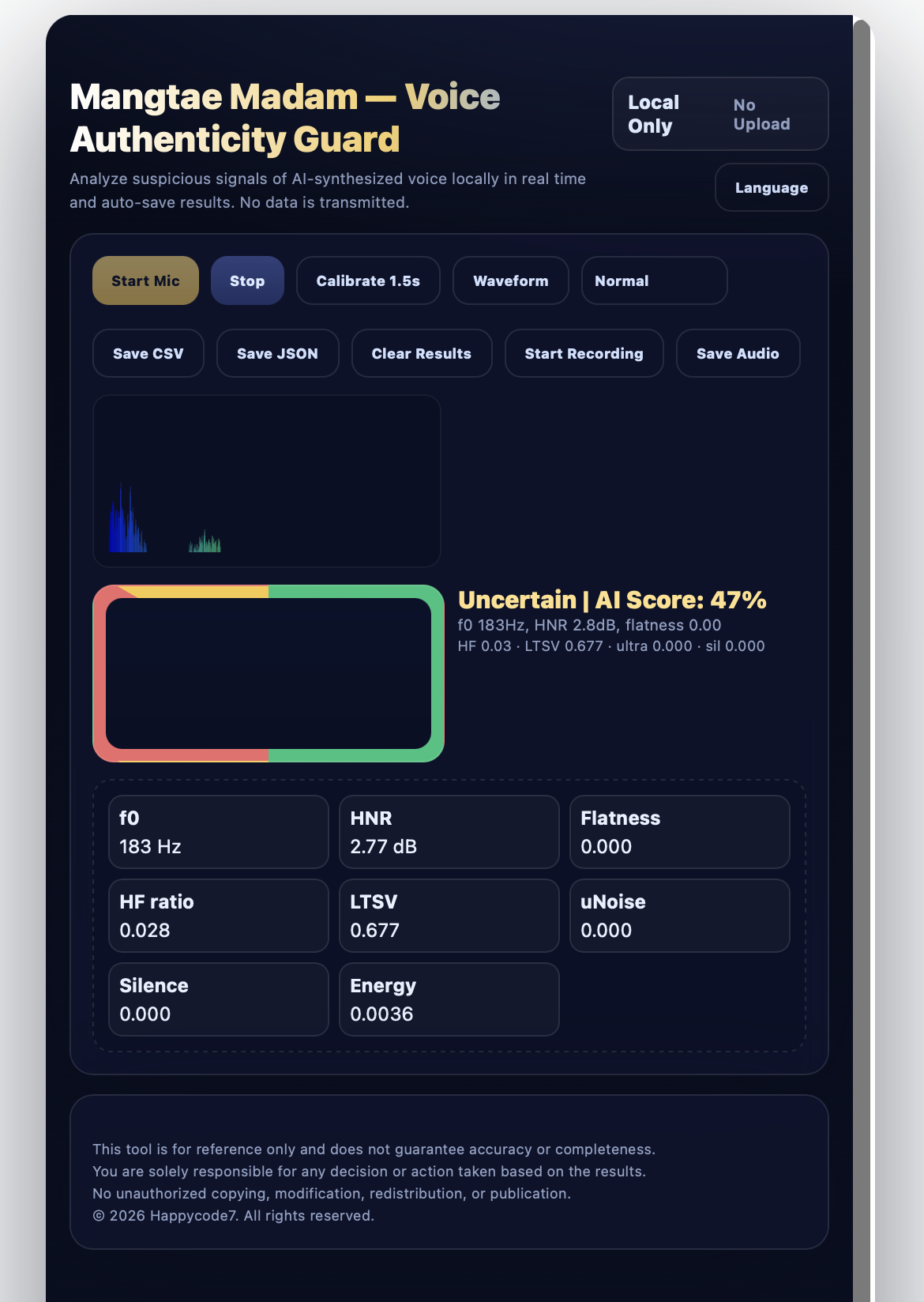 Mangtae Madam — Voice Authenticity Guard Analyze suspicious signals of AI-synthesized voice locally in real time and auto-save results. No data is transmitted. Local Only No Upload Language Start Mic Stop Calibrate 1.5s Waveform High Sensitivity Normal L