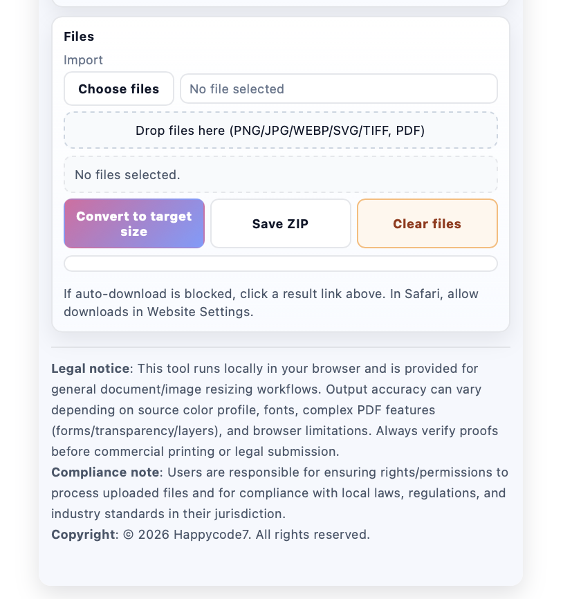 This tool is provided for general document and image formatting purposes. Output results may vary depending on browser environment, file complexity, fonts, and color profiles. Users must verify all outputs before commercial printing, official submission, or production use.