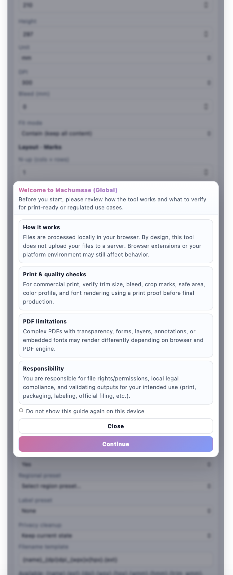 In addition, features such as DPI control (72/150/300/600), bleed settings, crop marks, safe area adjustments, and N-up layout make it suitable for users searching for print-ready PDF tools, label sheet generators, and document layout converters.