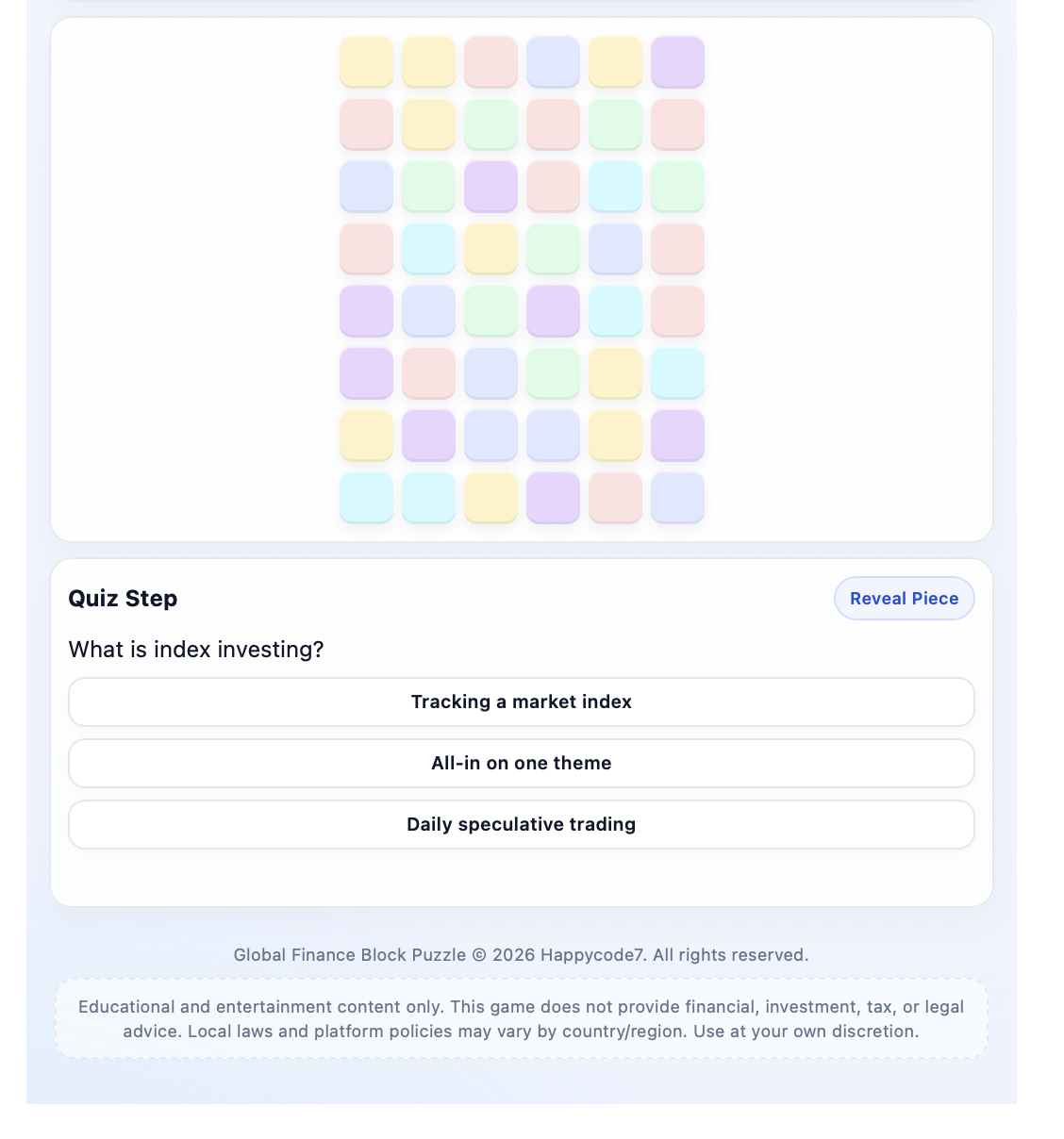 Global-friendly • Browser game Global Finance Block Puzzle Match blocks, solve finance mini-quiz steps, reveal the final shape, and unlock the center tile. Language How to Play Score0 Combox1 FeverOFF Mission- Coins0 Best0 Mode Casual Move Limit ..