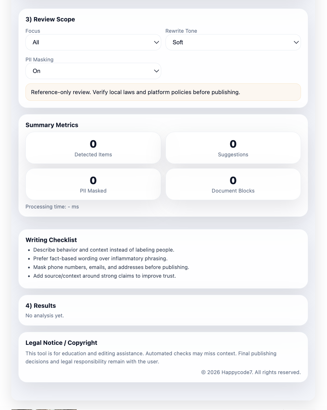 For users working across international audiences, maintaining clarity, neutrality, and compliance-aware tone has become increasingly important. This tool supports that need by identifying harsh or derogatory expressions, overgeneralized language, and potentially risky phrasing, while offering safer and more context-aware alternatives.